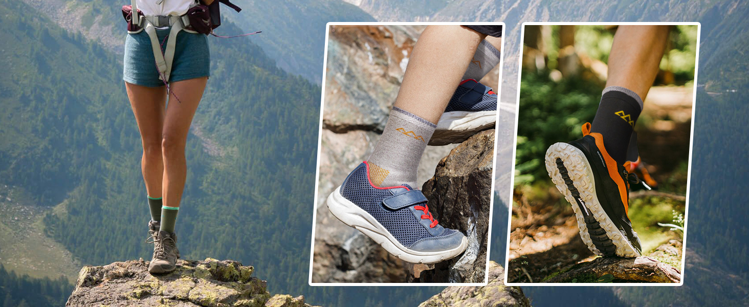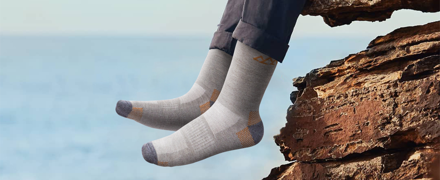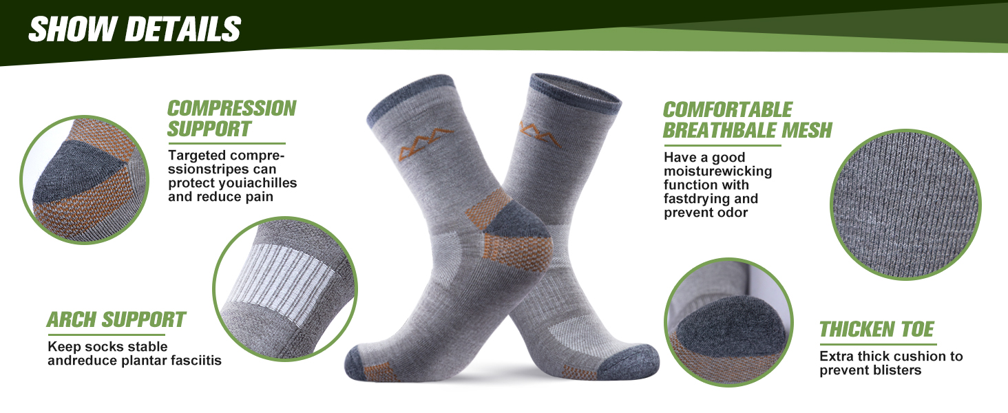 Comfort and performance are the top priority when it comes to hiking or other outdoor sports socks. Made of special blended merino wool material with fine gauge knitting technology, this 3 pack hiking socks set brings you both of them in a vibe design.