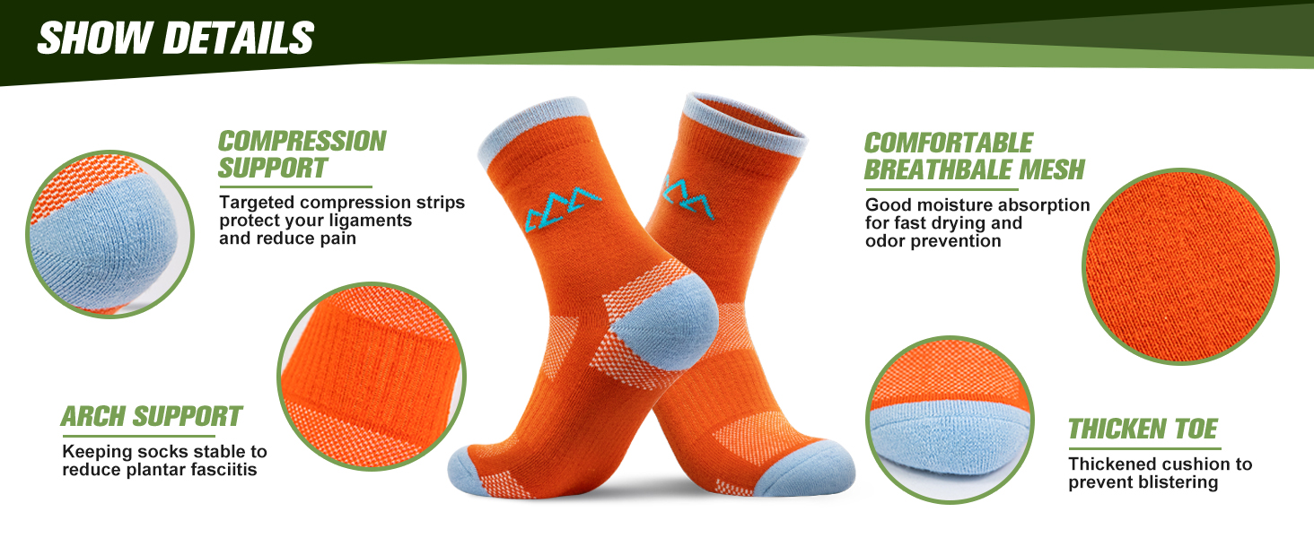 Comfort and performance are the top priority when it comes to hiking or other outdoor sports socks. Made of special blended merino wool material with fine gauge knitting technology, this 3 pack hiking socks set brings you both of them in a vibe design.