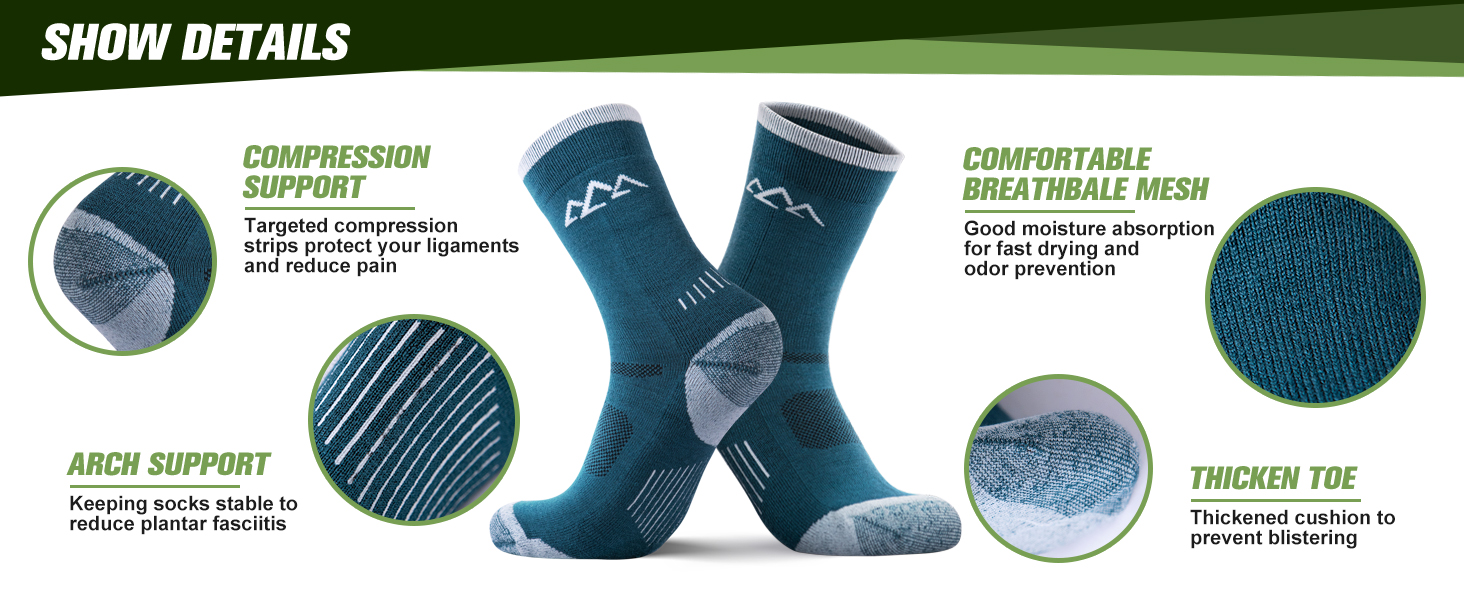 Comfort and performance are the top priority when it comes to hiking or other outdoor sports socks. Made of special blended merino wool material with fine gauge knitting technology, this 3 pack hiking socks set brings you both of them in a vibe design.